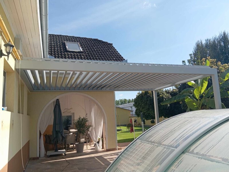 A bioklimatikus pergola modern, intelligens megoldás a kültéri élettér kényelmes és stílusos kialakítására. Egy olyan szerkezet, amely nemcsak árnyékot ad, hanem alkalmazkodik a napsütéshez, szélhez és csapadékhoz is – automatikusan vezérelhető módon.