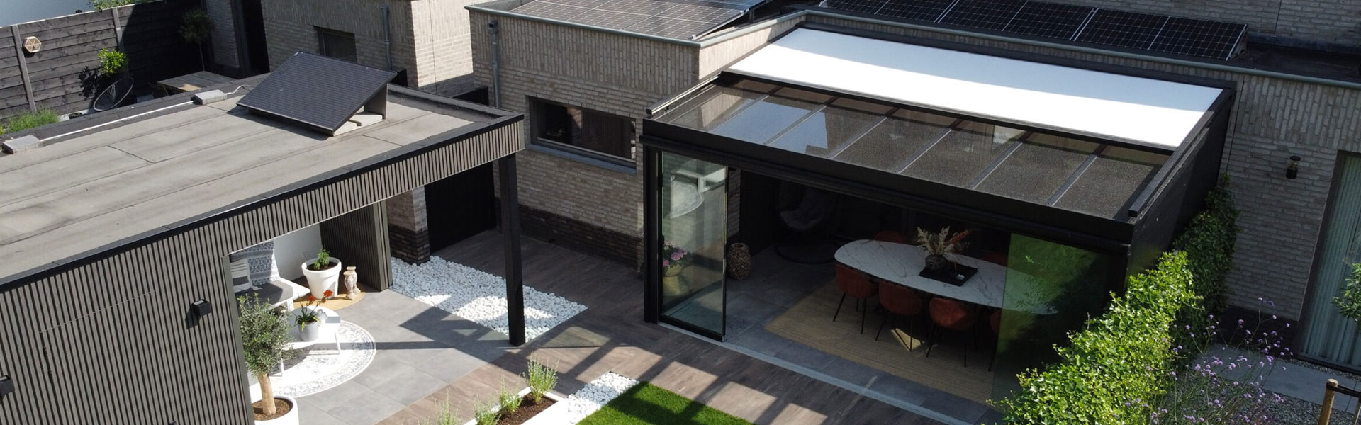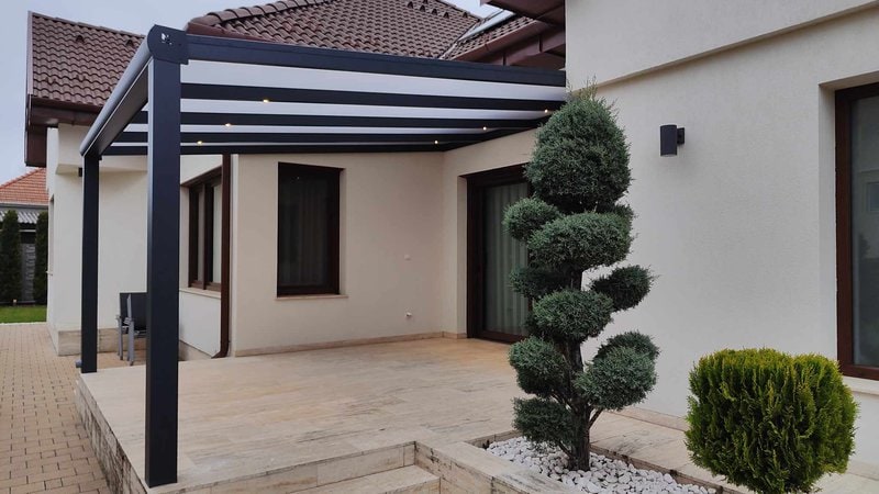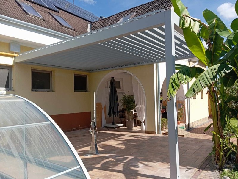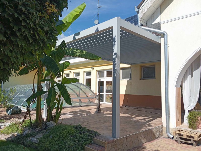 A tetőszerkezet vízszintesen elforgatható lamellákból áll, amelyek motorosan mozgathatók. Így szabályozhatod a fény bejutását, a levegő áramlását, sőt – zárt állapotban – az esővíz sem jelent problémát, mivel a rendszer teljes vízzárást biztosít, és az esővizet rejtett csatornákon vezeti el.