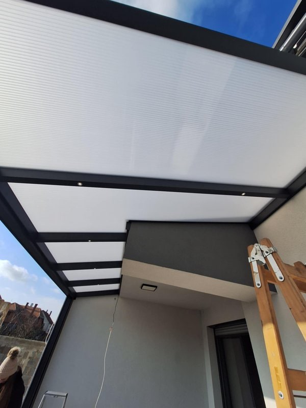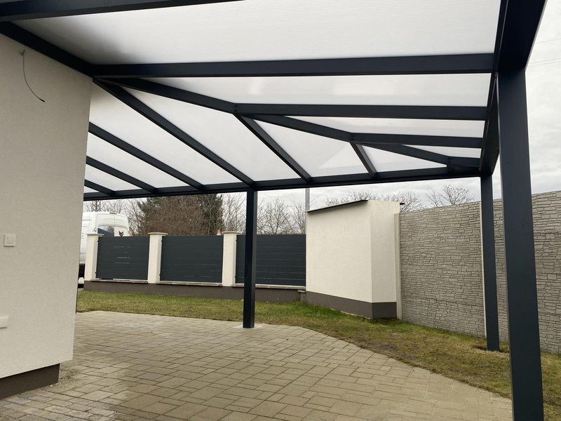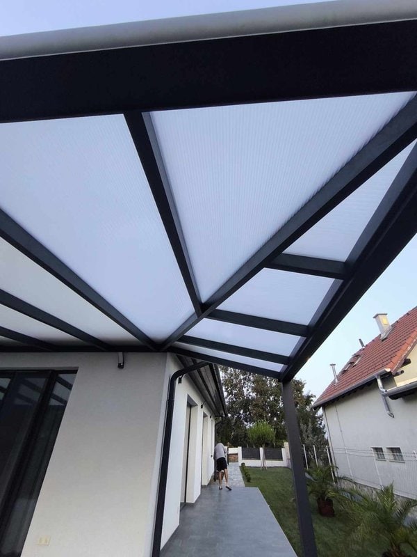 A >polikarbonát terasztető kitűnően fogja fel az erős napsugarakat, mégsem sötétíti el a teret, így kellemes fényhatást teremtve a teraszon. Mindemellett ellenáll a külső mechanikai hatásoknak, nem törik vagy reped, és nem igényel különösebb karbantartást sem. Az általunk használt üvegkamrás polikarbonát víztiszta, illetve opálos színben is választható.